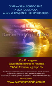 Workshop de três dias realizado em agosto na região Nordeste, em geral nas proximidades de Salvador – BA (Ponte da Felicidade.) Constituído de vivências à Luz do Yoga Integral, reúne trabalho no corpo, dança criativa e espontânea, exercícios de concentração, trabalhos criativos, leituras comentadas de textos dee Sri Aroubindo e d´ A Mãe.